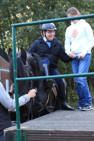 We hebben een speciale brug waar de ruiters met hun rolstoel oprijden of op kunnen lopen, zodat ze vanuit die positie gemakkelijker op hun pony kunnen komen.